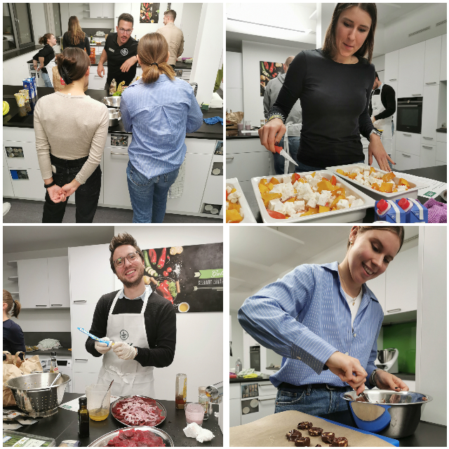 Unter Anleitung der AOK Mitarbeitenden, wurden von uns mehrere leckere Gerichte zubereitet. Auf dem Programm standen einige Vorspeisen, ein Hauptgericht aus Pasta, Kürbis und Feta Käse, sowie mehrere Nachspeisen. Alle Gerichte durften wir danach natürlich auch selbst genießen und wir fanden alles mega lecker. Da wird bestimmt das Eine oder Andere zu Hause mit auf den Speiseplan kommen.