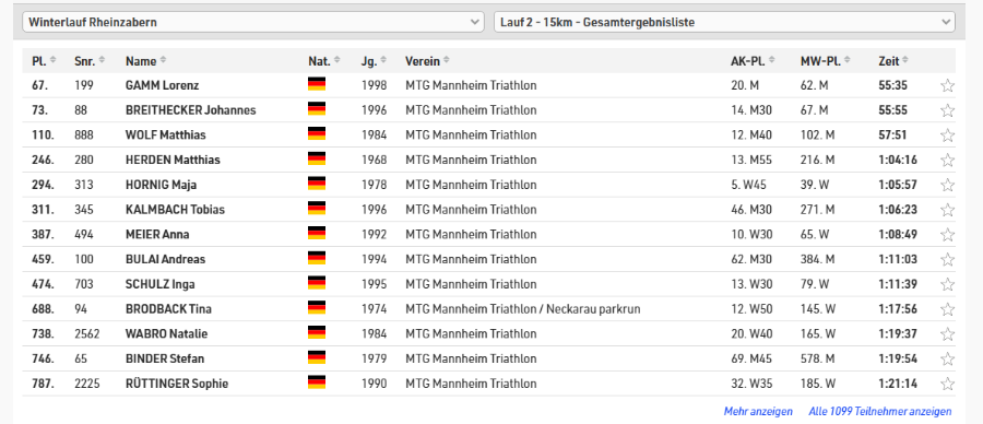 Die Athleten der MTG Mannheim Triathlon sind in diesem Winter wieder aktiv bei Wettbewerben in der Region. Nach den Silvesterläufen in Schifferstadt und Heddesheim, standen die nächsten Veranstaltungen der Winterlaufserien Rodgau und Rheinzabern an.